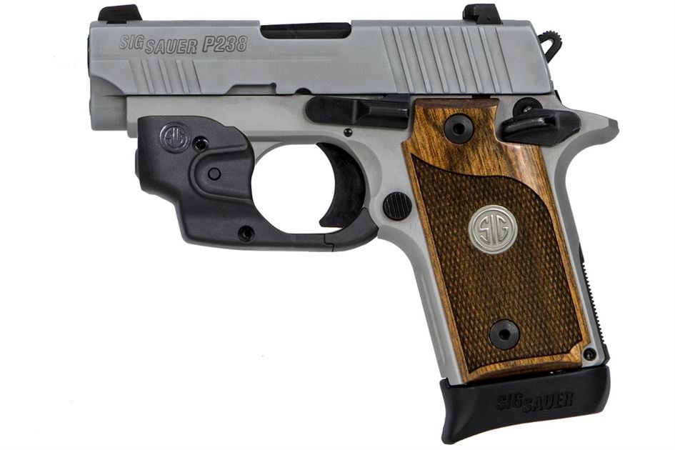 The P238 ASE (Alloy Stainless Elite). It’s just a fraction of the size of our full-size pistols. A smart looking, small handgun built with the same accuracy and reliability as large frame SIG SAUER pistols. With an overall length of just 5.5 inches a height of 3.96 inches, and weighing just 15.2 ounces, the SIG SAUER P238 is the ultimate firepower in an alloy frame concealed pistol. The ASE features a PVD-coated frame and slide, paired with walnut grips featuring the SIG mark.