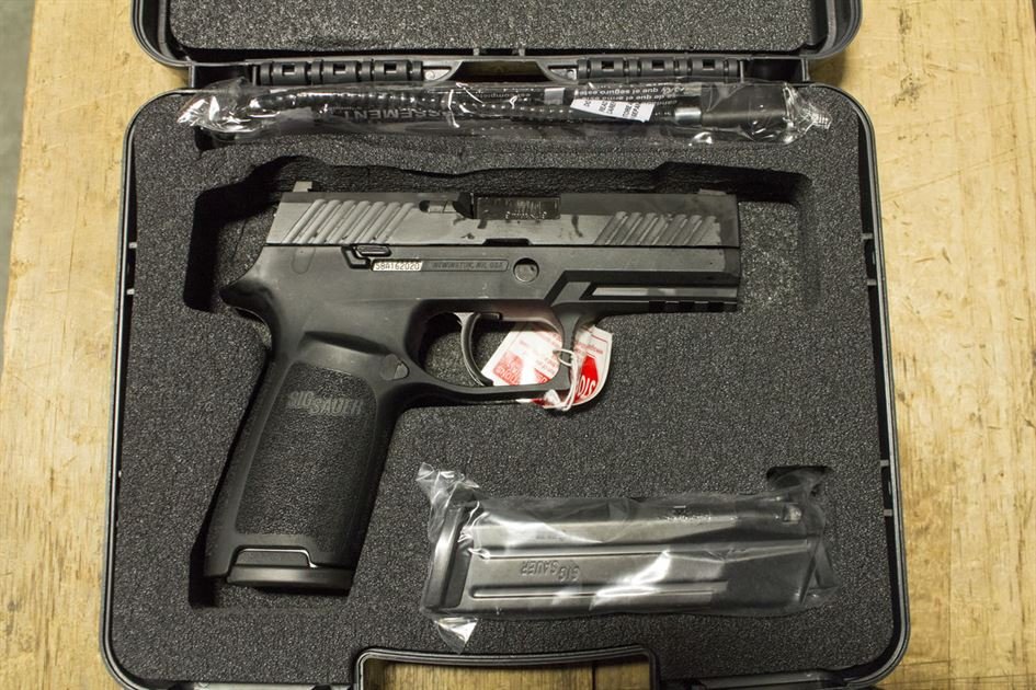 The photo represents the overall condition of these Sig Sauer P320 Carry 9mm police trades, which are new in box, unissued law enforcement trade-ins.