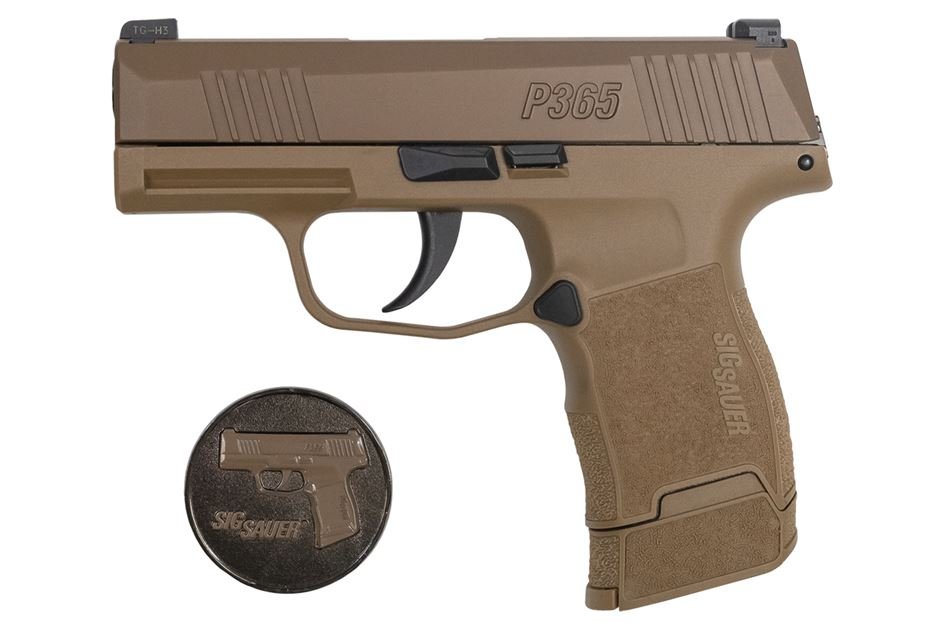 The NRA P365 features a coyote tan grip and slide, with all the same features of the award-winning SIG SAUER P365 everyday, concealed carry pistol This high capacity, micro-compact pistol is smaller and lighter than other pistols in its class featuring a high-capacity, patented modified double-stack magazine for a 10+1 full-size capacity. This unique package includes the popular 12-round magazine giving the P365 a 13-round capacity.