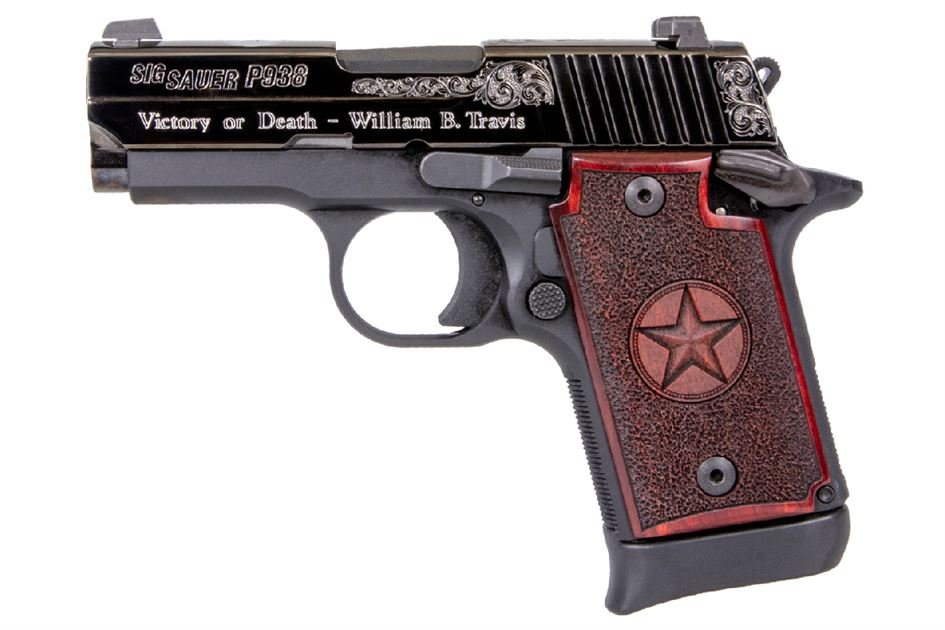 Sig Sauer’s 938 Engraved Texas edition features scrolled engraving on a polished Nitron slide with silver accents and custom Texas redwood grips emblazened with the Texas star. The top of the slide has an engraved Texas state seal, with “LONE STAR STATE” on one side, and “Victory or Death” William B. Travis on the other side.